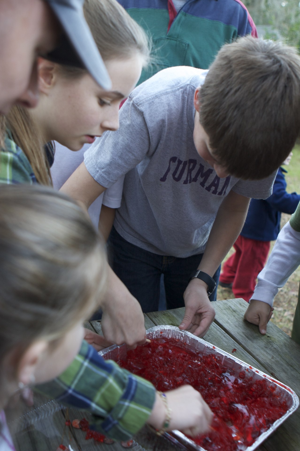 each team submitted 8 players to this game. and each person had one chopstick. they worked in pairs (one minute for each pair) to see how many pennies they could pinch out of the jell-o.